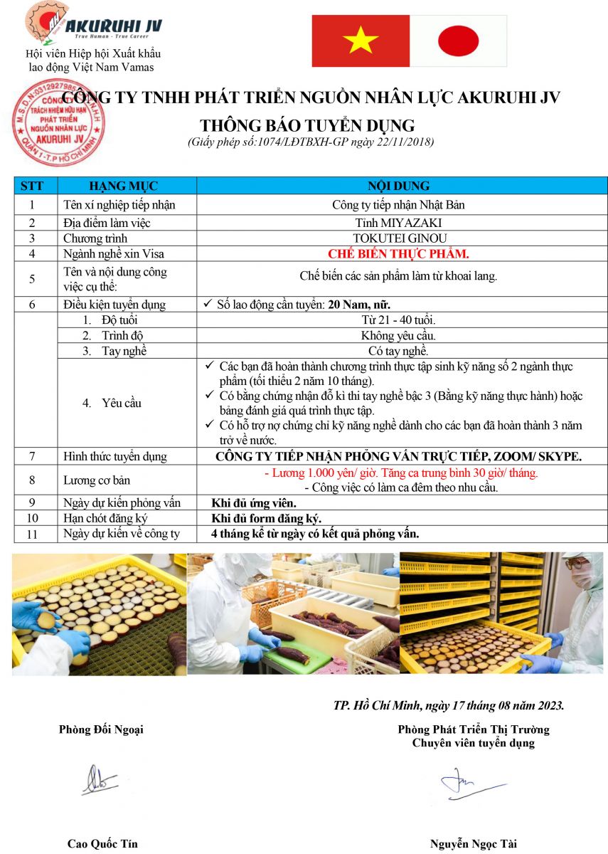 akuruhi jv, công ty akuruhi jv, akuruhijv, công ty xuất khẩu lao động nhật, lao động kỹ năng đặc định, tokutei gino, quay lại nhật lần 2, chế biến thực phẩm, đơn chế biến thực phẩm phí rẻ